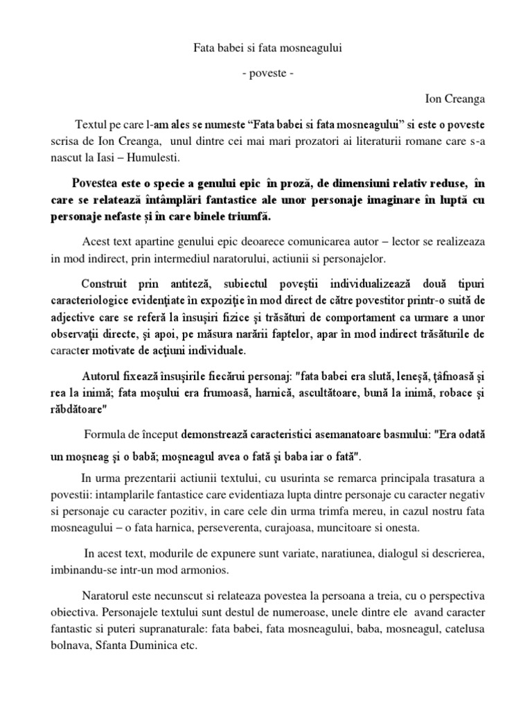 Rezumatul basmului fata babei si fata mosneagului un moșneag avea o fată frumoasă harnică și ascultătoare iar baba lui avea și ea o fată ce era urâtă leneșă și obraznică. împreună cu mama ei o ocărau mereu pe fata moșneagului până l au convins pe acesta ca e o pagubă la casa lor. Pentru că era fata ei baba nu o punea la nicio muncă în timp ce pe fata moșneagului o punea să facă toate muncile în gospodărie. Fata babei și fata moșneagului rezumat era odată un moșneag și o babă.