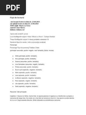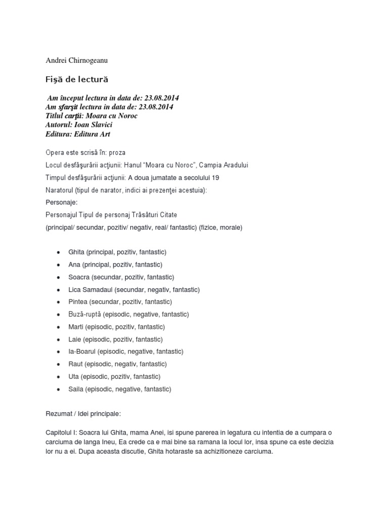 Hanul moara cu noroc campia aradului timpul desfurrii aciunii. Salvare salvați moara cu noroc fisa de lectura pentru mai târziu. Fisa de lectura moara cu noroc de ioan slavici nota 10 ioan slavici se naşte la 18 ianuarie 1848 la şiria lîngă arad. Ioan slavici date importante despre viața și activitatea autorului.