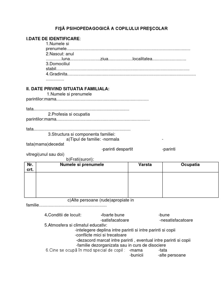 Fisa psihopedagogica a prescolarului. Fişa psihopedagogică a copilului preşcolar. 0 stele 0 review uri. 2 atmosfera și climatul familial. Sociabil comunicativ retras izolat puţin comunicativ turbulent agresivitate verbală agresivitate fizică alte particularităţi.
