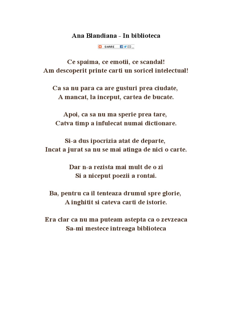 Dar n a rezista mai mult de o zi si a niceput poezii a rontai. Arhiva cu 133 versuri de ana blandiana inclusiv. Ca sa nu para ca are gusturi prea ciudate a mancat la inceput cartea de bucate. De eşti copil sau matur la sigur îţi sunt dragi poveştile.
