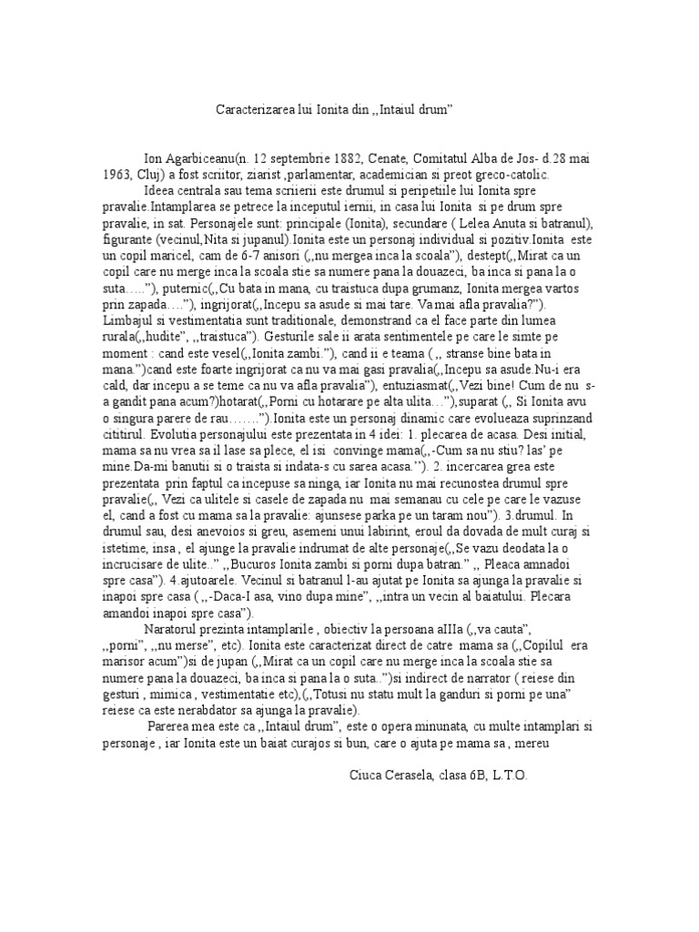Intaiul drum de ion agarbiceanu. Parca le pare rau dupa înalţimea din care vin se simt straini în lume şi se tem de ce vor afla jos pe pamant. Rezumat scurt pentru povestirea intaiul drum din manualul de clasa a 6 a in care este vorba despre un baiat de cinci ani care pleaca la pravalie iarna si se rataceste pe ulitele satului. Ideea centrala sau tema scriierii este drumul si peripetiile lui ionita spre pravalie intamplarea se petrece la inceputul iernii in casa lui ionita si pe drum spre pravalie in sat. Ion agarbiceanu în secțiunea povesti comenteaza la intaiul drum flutura rar cate un fulg de nea prin vazduhul sur.