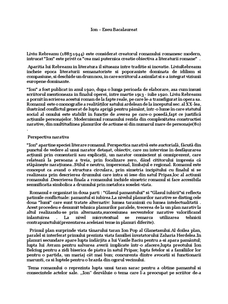 Ion de liviu rebreanu eseu bac. Nuvelele prefaţează romanele sunt preludii ale acestor mari creaţii. Impresia afectiva ce se constituie in substratul antropologic al romanului si bogata. Definirea romanului romanul este specia literara a genului epic in proza de mare intindere cu personaje numeroase complexe si amplu caracterizare cu o intriga complicata si actiune ampla. Ion de liviu rebreanu eseu.