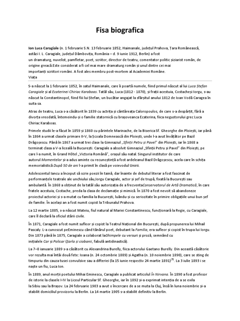 Pasionat de teatru caragiale a urmat în cadrul conservatorului din bucurești clasa de mimică și declamație unde profesor era unchiul său costache caragiale. Puteti gasi foarte multe referate accesand categoriile din partea dreapta despre caragiale fisa biografica. Ion luca caragiale poet şi dramaturg comentator politic şi ziarist român ion luca caragiale n. Caragiale fisa biografica mai jos o sa aveti mai multe rezultate pentru cautarea caragiale fisa biografica.