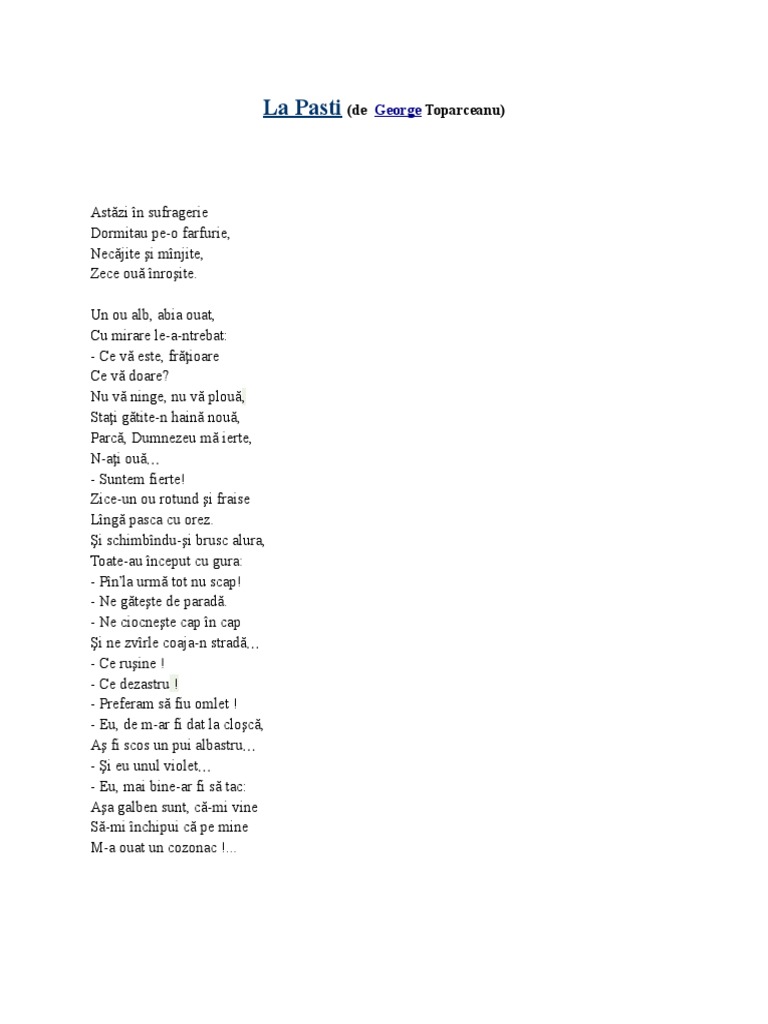 George toparceanu la pasti poezie lectura maia martin abonati va subscribe. Rasuflul cald al primaverii adus a zilele nvierii. 0 stele 0 review uri. Ne ciocnește cap în cap și ne zvîrle coaja n stradă ce rușine.