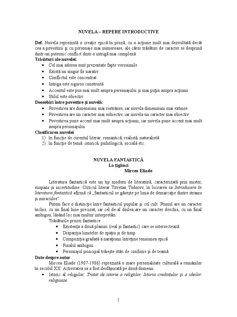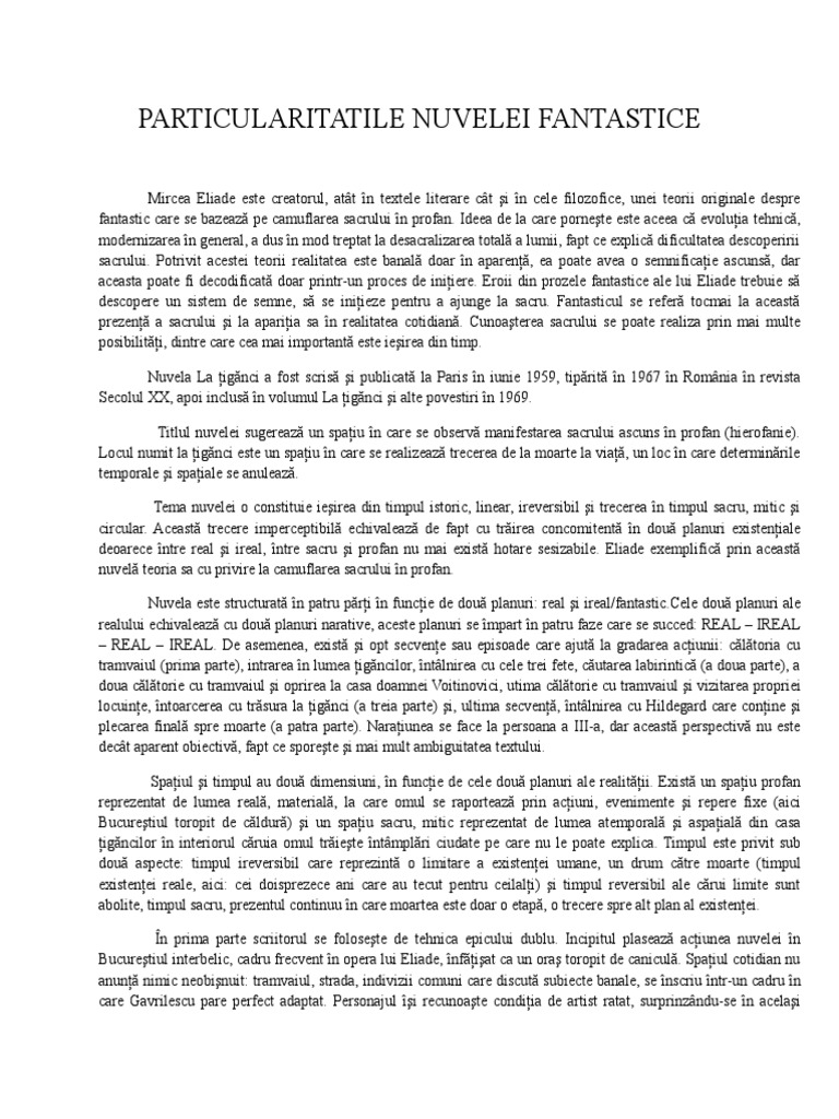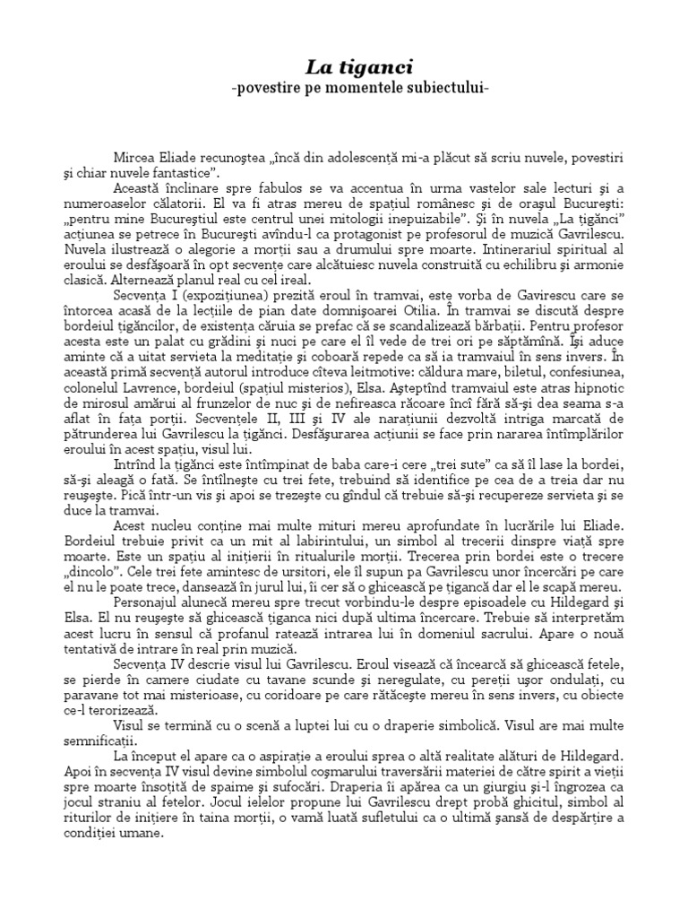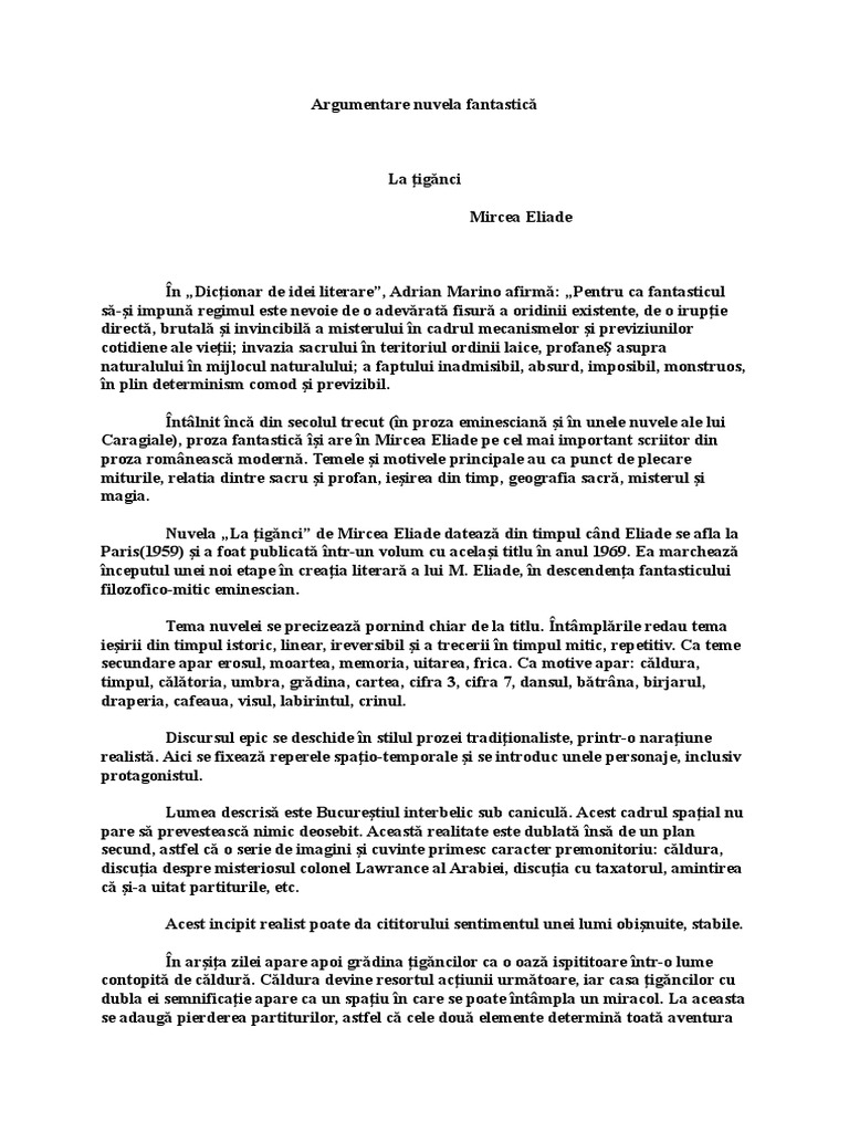 Eliade apartenenta textului la nuvela fantasticanuvela fantastica este opera epica in proza care antreneaza doua planuri narative unul al realitatii si unul al misteriosului in care evolueaza un erou aflat in imposibilitatea de a da o explicatie celor intamplate. La tiganci argumentare nuvela fantastica. Ea a fost scrisă în iunie 1959 la paris și publicată în anul 1963 în volumul nuvele tipărit de cercul de studii destin din madrid. Setea lui gavrilescu poate simboliza suferinţa ce defineşte condiţia umană.