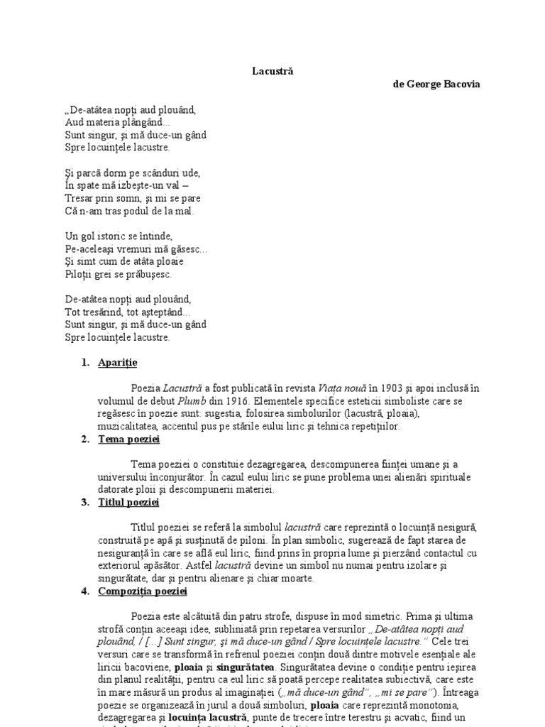 Publicata in volumul plumb aparut in 1916 poezia lacustra apartine esteticii simboliste si este reprezentativa pentru universul bacovian. Poezia lacustra face parte din volumul de debut plumb si este emblematica pentru atmosfera dezolanta specifica liricii bacoviene exprimand prin simboluri si sugestii trairile si starile sufletesti ale poetului. George bacovia lacustră comentariu literar poezia lacustră prezintă atmosfera dezolantă caracteristică universului liric bacovian. Titlul este simbolic lacustra este o locuinţă temporară nesigură construită pe apă susţinută de piloni din lemn.