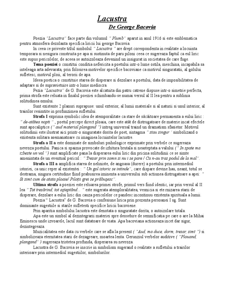 Lacustra de george bacovia comentariu. Poezia lacustra a lui george bacovia se inscrie in universul tipic simbolist mai ales prin dramatismul trairilor eului liric solitudine angoasa monotonie nevroza dar si prin tehnica repetarii temelor si a simbolurilor prin cromatica prin modul de. Dezvoltarea argumentelor titlul poeziei este simbolic cu sens denotativ lacustra reprezintă o locuinţă primitivă din paleolitic. Lacustră de george bacovia comentariu simbolismul este un curent literar apărut în franţa al cărui teoretician este jean moreas prin manifestul literar le symbolisme în care vorbeşte despre o artă care va fi împotriva falsei sensibilităţi şi susţine că poezia trebuie să sugereze doar şi nu să descrie. Lacustra de george bacovia comentariu literar.