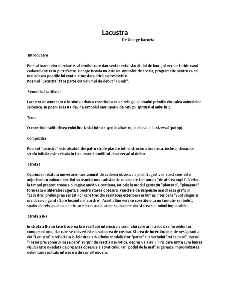 Lacustră de george bacovia comentariu simbolismul este un curent literar apărut în franţa al cărui teoretician este jean moreas prin manifestul literar le symbolisme în care vorbeşte despre o artă care va fi împotriva falsei sensibilităţi şi susţine că poezia trebuie să sugereze doar şi nu să descrie. Un gol istoric se întinde. De atâtea nopți aud plouând aud materia plângând. Desi bacovia publica si inainte de razboi opera sa apartine in majoritate perioadei interbelice dominata de cele doua orientari literare majore modernismul si traditionalismul.