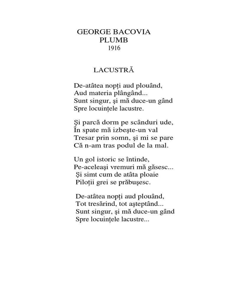 De atâtea nopți aud plouând aud materia plângând. Analiza literara argumenteaza apartenenta poeziei la simbolism. Poezia lacustră face parte din volumul de debut plumb apărut în 1916 şi este emblematică pentru atmosfera dezolantă specifică liricii lui george bacovia exprimând prin simboluri şi sugestii trăirile şi stările sufleteşti ale poetului. învăţământ liceal limba şi literatura român ă.