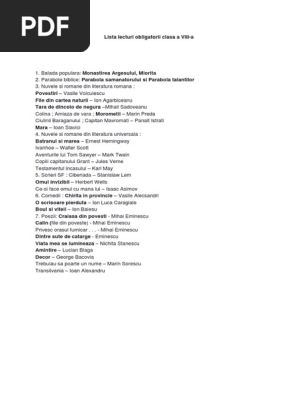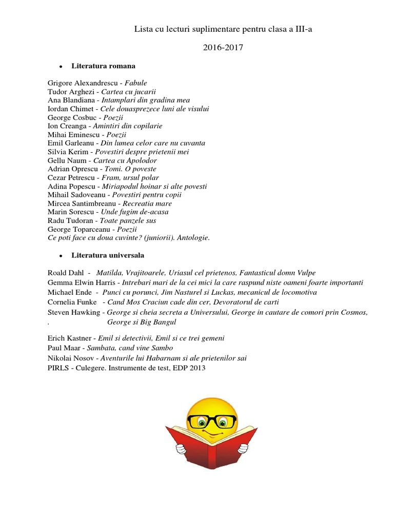Lista de lecturi pentru clasa a v a. Lecturi suplimentare clasa a vi a liric mihai eminescu. Intra si vezi oferta completa. Răspunde răspunde cu citat citat 23 eu 14 06 2011 15 19.