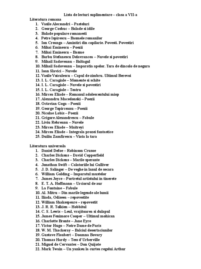 Lecturi obligatorii literatura româna pentru clasa a vii a 1. Lectura suplimentara clasa 7 carti clasa 7 carti suplimentare clasa 7 lectura clasa 7 lectura suplimentara este obligatorie pentru elevi cu atat mai mult pentru cei de clasa a vii a care se pregatesc sa participe la primul examen national important din viata lor care le asigura si admiterea la liceu. Calistrat hogaş amintiri dintr o călătorie 7. Lecturi suplimentare clasa a vii a liric mihai eminescu.
