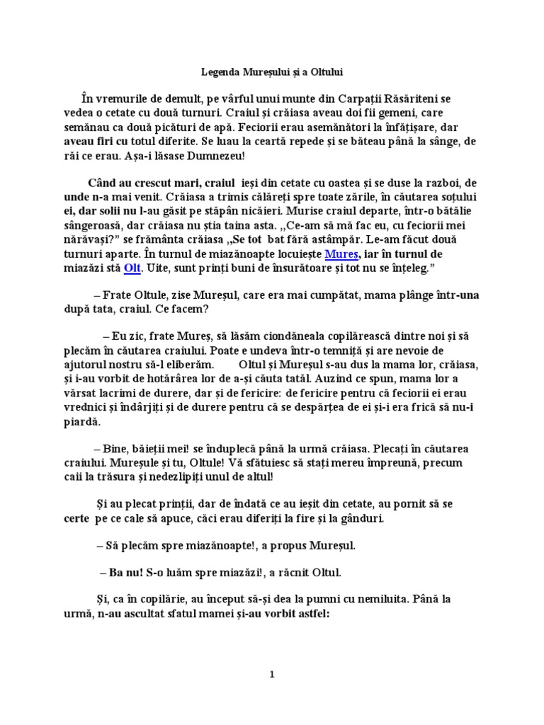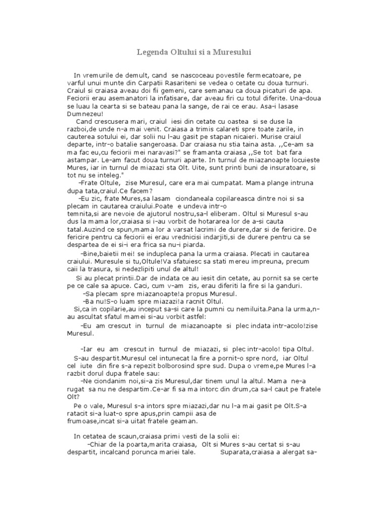 Legenda oltului si a muresului cele doua mari rauri de la noi au intrat in constiinta publica prin una dintre cele mai frumoase legende in vremurile de demult cand se nascoceau povestile fermecatoare pe varful unui munte din carpatii rasariteni se vedea o cetate cu doua turnuri. Se poate folosi la geografie l română interdisciplinar sper să vă fie util. Trăia odată un împărat pe vârful unui munte într o cetate cu două turnuri. A fost odată în vremuri îndepărtate când se năşteau poveştile în vârf de munte o falnică cetate cu două turnuri.