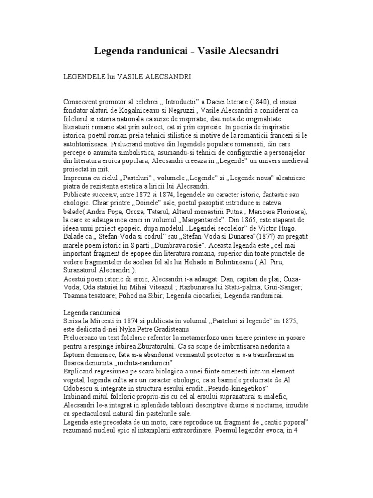 Legenda randunicai de vasile alecsandri. Legenda rândunicăi este o operă scrisă de vasile alecsandri în anul 1874 la mircești iași iar apoi a fost în volumul legende și pasteluri în anul 1875. Rândunică rândunea ce baţi la fereastra mea. Din vremuri de demult n a fost fata mai frumoasa ca lia fata de imparat. Vă așteptăm cu drag să reveniți pe acest site în fiecare zi.