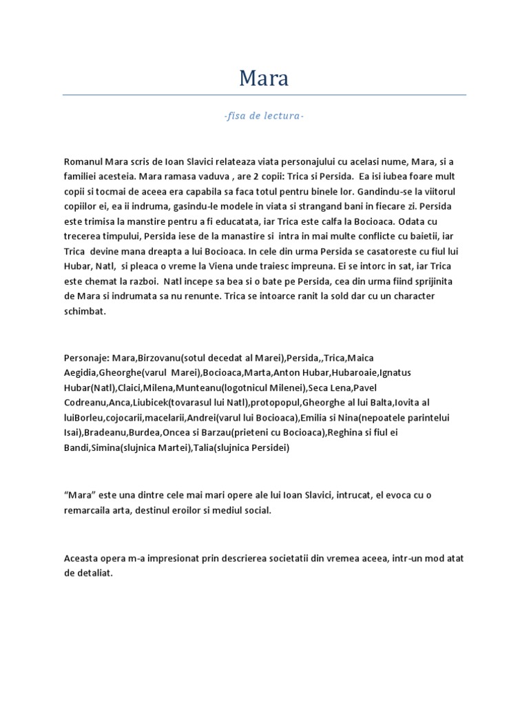 Mara fisa de lectura. Tuesday 13 october 2020 turda ioan ratiu 54 3 tel. Sa faca orice pentru a i vedea sanatosi si fericiti într un cuvânt pentru a le fi cât mai bine. Fișă de lectură mara pădurea spânzuraților alexandru lăpușneanu. Strângea bani zi de zi pentru ei doi si pentru înmormântare.