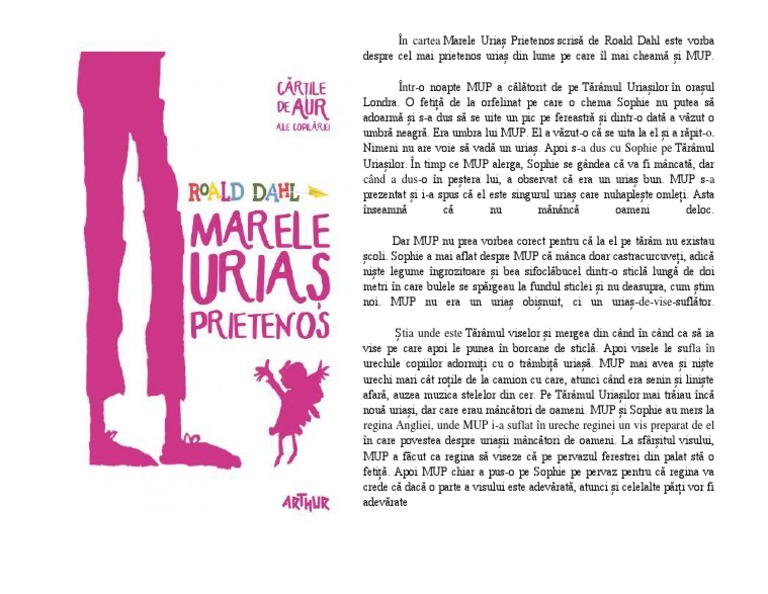 Eu este singurul uriaș cumsecade și zăpăcit din tot tărâmul uriașilor. Marele uriaș prietenos este o poveste pentru copilul din tine ascuns în haine de adult îngrijorat și mereu pus pe gânduri. Rezumatul marele urias prietenos de 19 25 randuri dau coroana urgent brainly ro. Povestea se desfășoară în jurul uriașului mup și a micuței sophie care în toiul nopții îl surprinde pe acesta de la fereastra orfelinatului făcând un lucru tare misterios.