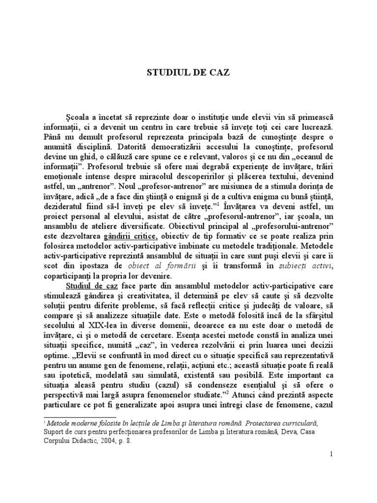 Metoda studiului de caz. Metoda studiului de caz este utilizată eficient şi în cadrul orelor de biologie unde se impune confirmarea multor idei prin efectuarea anumitor experienţe etc. Studiul de caz presupune realizarea unei cercetări ceea ce include şi elemente de. 12 mai 2009 19 36. Studiul de caz este o metodă prin excelenţă calitativă ce constă în abordarea complexă multilaterală a unei entităţi sociale de la indivizi până la comunităţi sau organizaţii cu scopul de a ajunge la o imagine cât mai completă holistică posibil despre acea entitate.