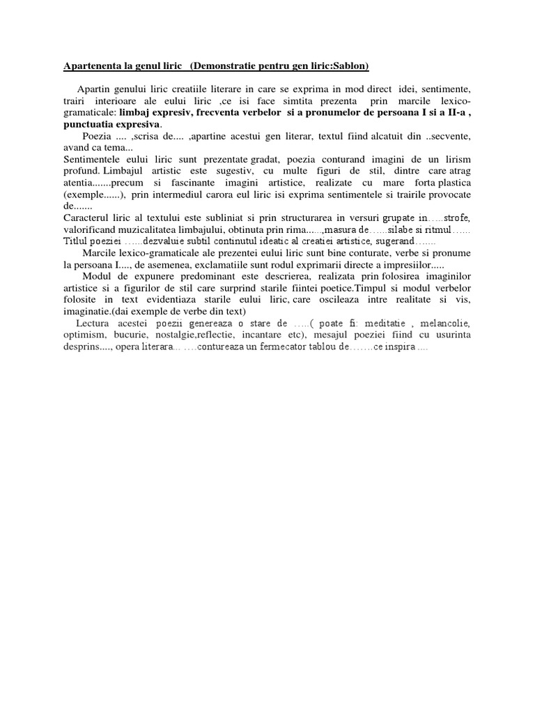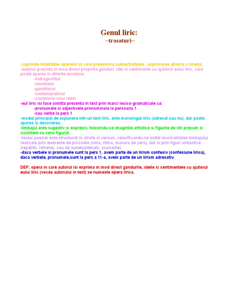 Modurile de expunere pot coexista în cadrul uneia şi aceleiaşi opere apartenenţa la gen fiind marcată de ponderea unuia sau a altuia dintre moduri ca şi de alte considerente de conţinut sau formale. Genul liric este genul literar in care autorul isi exprima in mod direct gandurile ideile sentimentele si trairile prin intermediul eului liric moduri de expunere dscrierea dialogul si monologul trasaturi prezenta eului liric structura specifica in versuri exprimarea gandurilor in mod direct specii pastelul doina poezia oda imnul meditatia idila ce e dupa poezie nu se da la evaluare. Concepte operationale figuri de stil epitetul partea de vorbire sau de fraza care determina in lucrarile sau actiunile exprimate printr un substantiv sau verb insusirile lor estetice adica acelea care pun in lumina felul cum le vede sau cum le simte scriitorul si care au un rasunet in sensibilitatea si fantezia cititorului tudor vianu.
