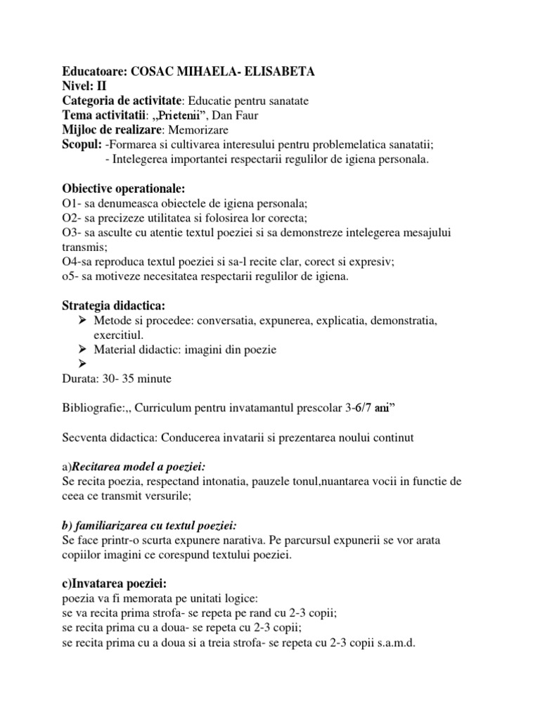 Activitatile propuse sunt axate pe metode activ participative care incurajeaza plasarea copilului in situatia de a explora si de a deveni independent. Orele acestea intră în norma educatoarelor deci nu mai pot fi plătiți de către părinți profesori din afara grădiniței și. Ulterior respectiv în anul 2005 2006 este elaborată strategia ministerului educaţiei şi. 1 anexa la ordinul ministrului educației naționale nr.