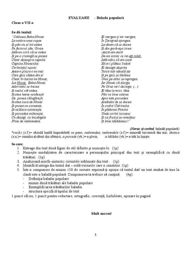 Asculta de ce ti zic eu sa nu cazi la vreun loc rau la loc rau si mult departe in neagra strainatate. In vremea lui minai viteazul la tarigrad. Ajutor la teme teze simulari si evaluarea nationala clasa a viii a la romana. Balada populară este o operă epică în versuri în care sunt relatate întâmplări cu caracter istoric legendar fabulos eroic familiar fantastic uneori textul interpretat de un rapsod este acompaniat de un instrument.