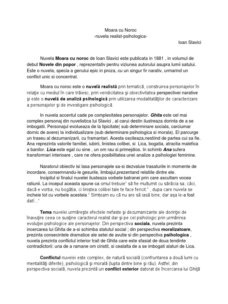 Publică în 1881 moara cu noroc în volumul novele din popor scriere ce devine reprezentativă pentru ilustrarea viziunii autorului asupra vieții rurale caracterizată de o notă profund tradițională. Acţiunea se petrece în anii. Nuvela moara cu noroc este o proza realista de analiza psihologica publicata in 1881 in volumul de debut al lui ioan slavici novele din popor reprezentativ pentru viziunea autorului asupra lumii satului. Nuvela psihologica moara cu noroc ioan slavici.
