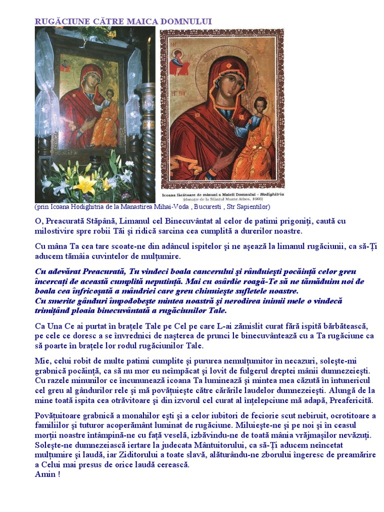 Paraclisul maicii domnului mihai voda. Icoană făcătoare de minuni îndeosebi spre vindecare de cancer şi spre dăruire de copii celor care nu îi pot avea. Se citeşte de 40 de ori conse. Slavă ție dumnezeul nostru slavă ție. Pe care tot glasul o lauda ca pe o pazitoare si mare scapare.