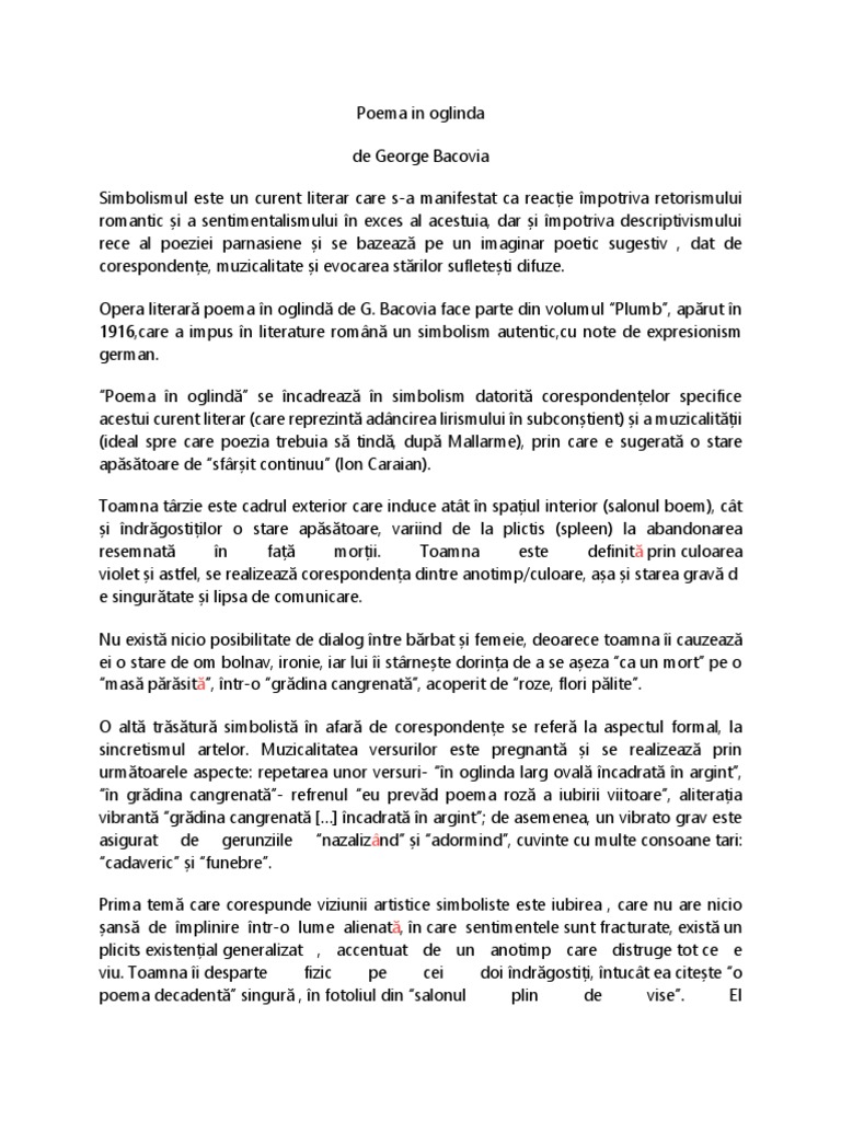 Poema in oglinda aparuta in volumul plumb 1916 explica in buna masura mecanismul reflectarii in universul poetic bacovian felul in care elementele spatio temporale exterioare devin peisaj interior si perceptie sinestezica in maniera simbolista. Enigma otiliei george călinescu comentariu literar la apariţia enigmei otiliei în 1938 în două volume romanul ca specie a literaturii avusese o evoluţie extrem de rapidă dominând literatura românească interbelică. în fotoliu ostenită în largi falduri de mătase pe când cade violetul tu citeşti nazalizând. Poema în oglindă în salonul plin de vise.