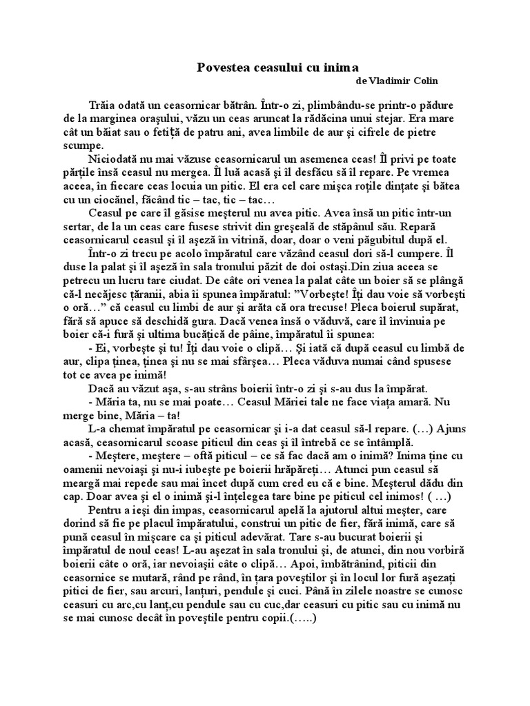 Insa a trecut pe. Apoi a pus ceasul in vitrina pt a l recunoaste pagubasul si a l lua inapoi. Povestea ceasului cu inimă de vladimir colin. Un ceasornicar batran a gasit un ceas de aur si pietre scumpe care nu functiona deoarece n avea pitic ceasurile pe timpul acela erau puse in miscare de un pitic cu ciocanel.