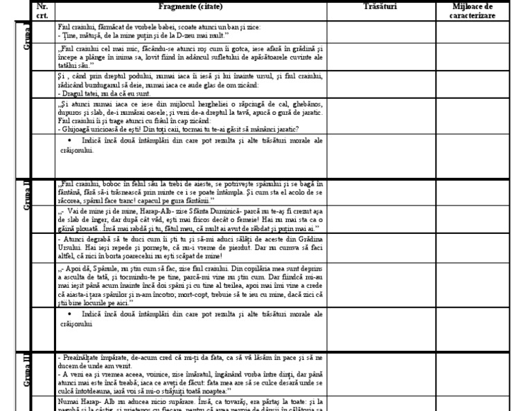 Personajele din aceasta opera sunt tipologizate dupa mai multe criterii ele fiind personaje negative pozitive ajutoare donatoare etc. Caracterizarea lui harap alb. Un comentariu care care face caracterizarea fiului de imparat care in prima faza este pacalit de spân si se alege cu numele de harap alb. Amu cică era odată într o ţară un crai care avea trei feciori.