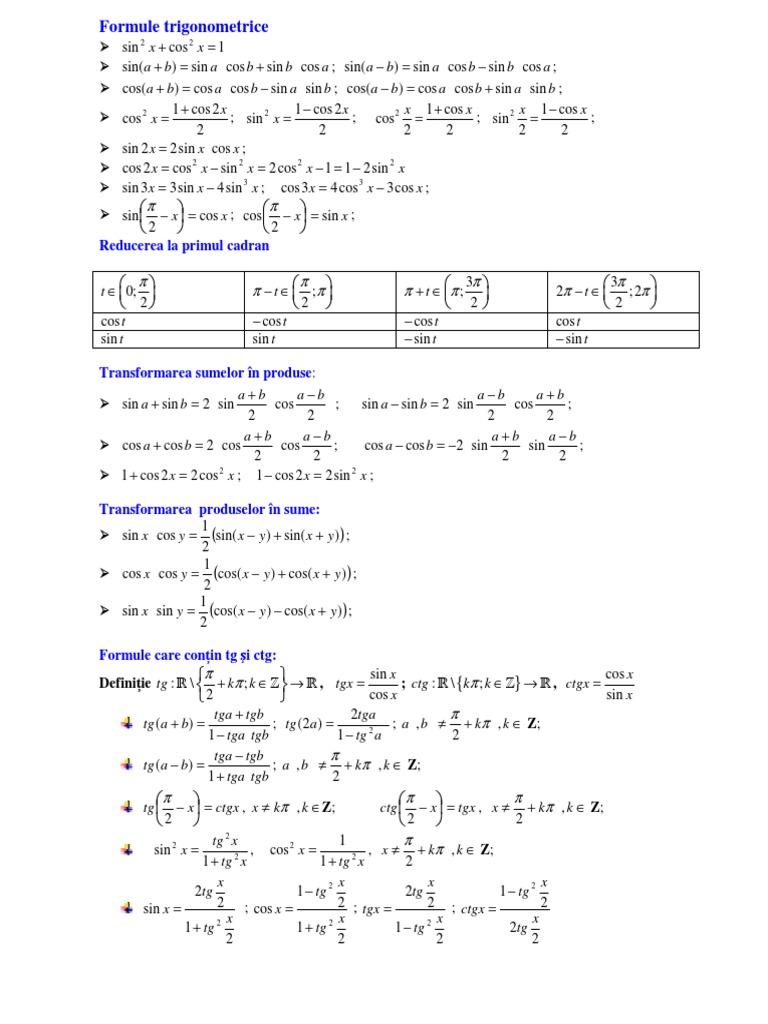 La fel vom proceda și atunci când trebuie să calculăm funcții trigonometrice ale unor unghiuri cu măsuri mai mari de 360 grade care depășesc primul cerc. Formule de reducere la primul cadran. Sau intra in cont cu. Identităţi fundamentale 22 sin cos cos sin 22 22 sin cos 1 1 x xxx tg x ctgx ctg x tgx x x tgx ctgx reducerea la primul cadran.