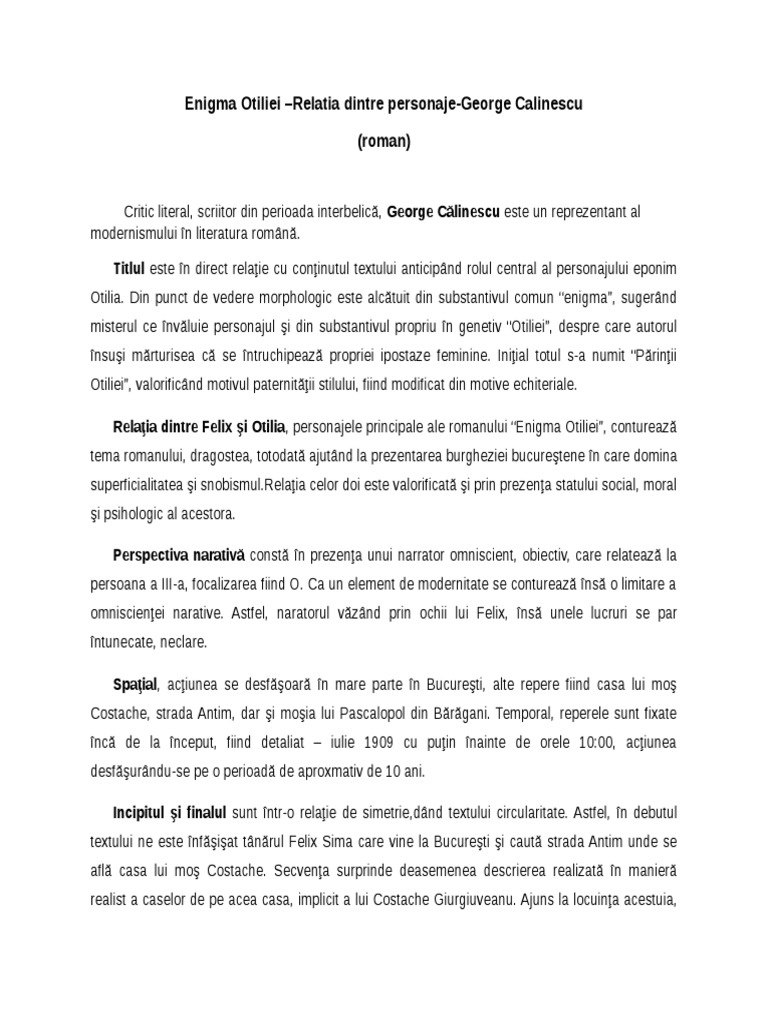 Relatia dintre felix si otilia referat felix si otilia felix si otilia cuplul adolescentin visat originalitatea romanului enigma otiliei enigma otiliei rezu. Cei doi sunt personaje principale otilia ilstrând tipul cochetei iar felix pe cel al intelectualului în formare singurul personaj rotund al operei. In ciuda insistentelor lui felix ca otilia sa renunte la protectia si la sprijinul lui pascalopol adolescentul insusi este nevoit sa admita ca fara prezenta acestuia viata in casa de pe strada antim e lipsita de sens. Ultima întâlnire dintre felix și otilia înainte ca aceasta să se căsătorască cu pascalopol și să plece definitiv din țară este esențială pentru înțelegerea personalității tinerilor și a atitudinii lor față de iubire.
