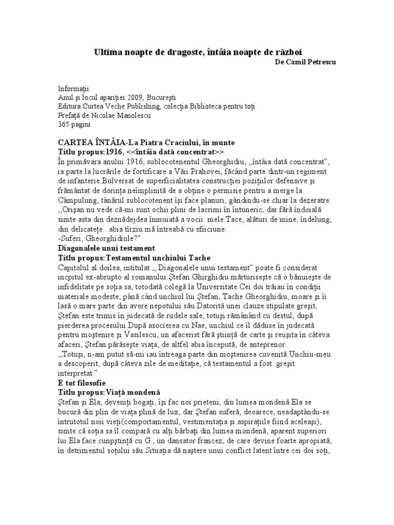 Rezumat pe scurt ultima noapte de dragoste intaia noapte de razboi. Read story ultima noapte de dragoste intaia noapte de razboi rezumat by filipmarinca filip marinca with 47 369 reads. Camil petrescu a fost un nuvelist romancier dramaturg poet şi doctor în filosofie român. Ultima noapte de dragoste r. Cartea nti la piatra craiului in munte actiunea primului capitol se desfasoara in primvara anului 1916 in timpul actiunilor de fortificare tara pregtindu se pentru intrarea in primul rzboi mondial.