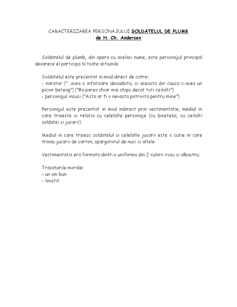 Câștigă puncte și ajută ți echipa să i învingă pe crocobeți. Din păcate plumbul nu ajunsese pentru toți așa că unul dintre ei nu avea un picior dar stătea și el drept cu pușca în mână. Caracterizare soldatelul de plumb mai jos o sa aveti mai multe rezultate pentru cautarea caracterizare soldatelul de plumb. Rezumatul textului soldatul de plumb cit ma scurt 1 vezi răspunsul.