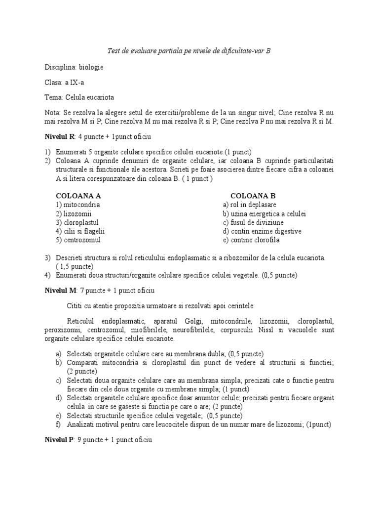 Test Biologie Clasa 9 Celula