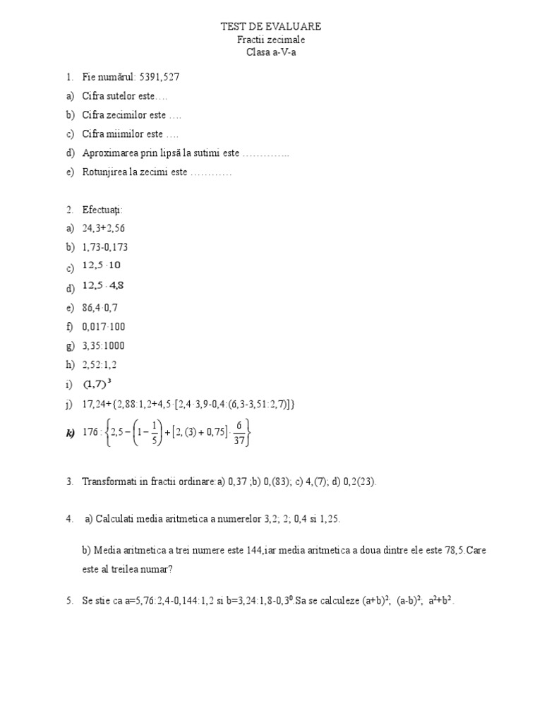 Operatii cu fractii zecimale 3. Toate resursele necesare pregatirii online a elevilor de clasa a v a. Mesaj pentru autor. Test clasa a v a fişă de lucru fracţii zecimale.