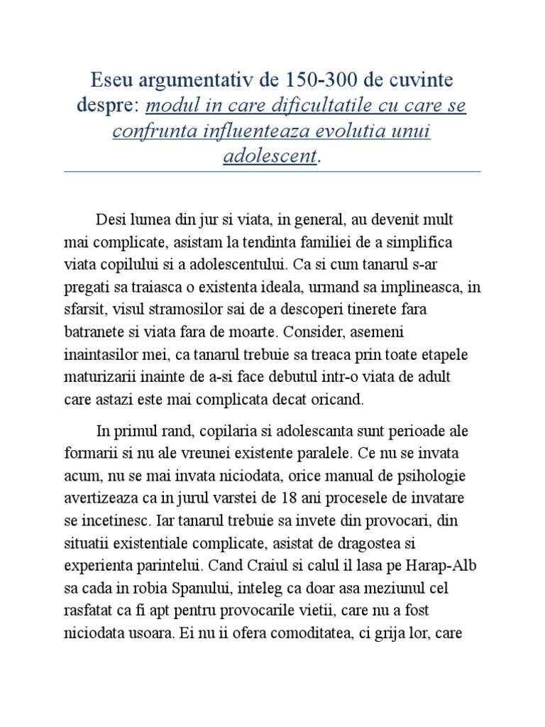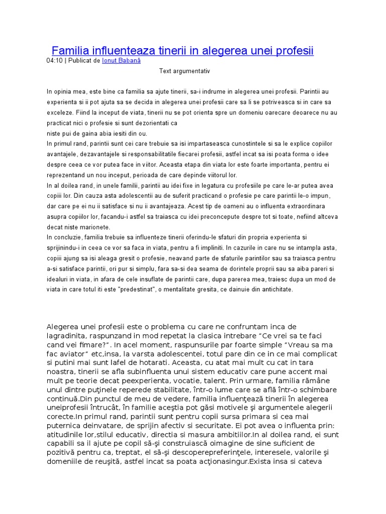 Medicamentele și sfaturile familiei sunt două lucruri mai plăcute de oferit decât de primit. Profesorii noștri au redactat rezolvarea cerinței de a scrie un text de tip argumentativ de 150 300 de cuvinte 15 30 de rânduri despre modul în care familia influențează tinerii în alegerea unei profesii care se regăsește în modelul de subiect ii al examenului de bacalaureat publicat în 01 01 2013 pentru profilul real și în varianta 94. Ea are un rol decisiv în ceea. El trebuie sa pastreze o amintire placuta despre aceste zile si sa isi aminteasca cu drag de aceasta perioada.