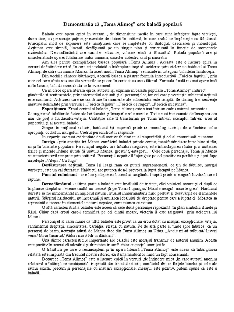 Demonstrarea ca balada toma alimos e o balada populara referat romana demonstrarea ca balada toma alimos e o balada populara toma alimos argument de balada populara din noaptea adanca a trecutului nostru strabunii ne au transmis pe cale orala o mostenire artistica.