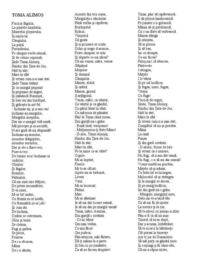 Toma alimos balada populara. Inchinar as murgului murgului sirepului dar mi e murgul vita muta ma priveste si m. Videoclip filmat cu camera web a utilizatorului veronica popa pe 12 iunie 2012 02 23 pdt. O astfel de balada este si creatia populara toma alimos. A ospitalier haiducul toma îl trateaza cum se cuvine pe boierul manea oferindu i frateste jumatate din vinul din plosca.